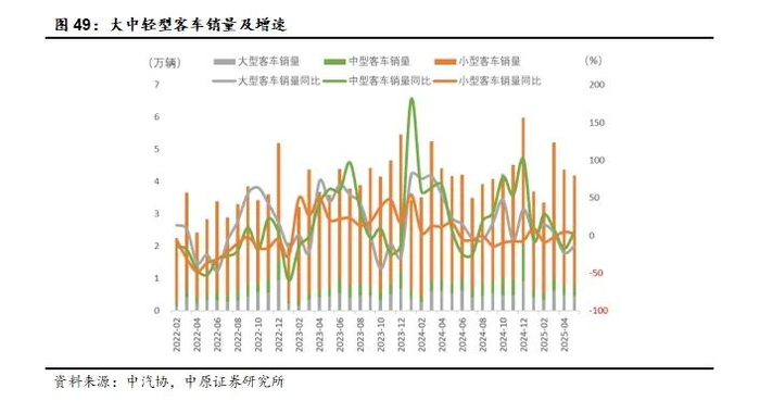 轻型客车为客车销售的主要类型,2025年前5个月领涨客车各细分市场。轻型客车近年来销售整体呈增长趋势,增速较中型和大型客车相比更为稳定。根据中客网数据,2025年前5月大型、中型、轻型客车累计销量分别为2.50万辆、1.52万辆和17.22万辆,累计同比增速分别为-2.51%、-0.26%和1.09%,2025年前5月轻客同比增长,领涨客车各细分市场。从市场占比看,2025年前5月大中轻客车销量占比分别为11.77%、7.16%和81.07%。