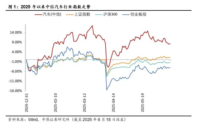 截至2025年6月18日收盘,2025年汽车(中信)板块涨跌幅为8.23%,同期上证指数、沪深300指数、创业板指数涨跌幅分别为1.11%、-1.52%、-4.06%,汽车板块分别跑赢同期上证指数、沪深300指数、创业板指数7.12pct、9.75pct、12.29pct,汽车行业走势明显强于大盘。