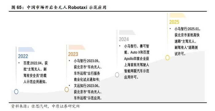 中美处于Robotaxi第一梯队,从示范运营向大规模商业化进阶。特斯拉暂定将于6月22日在奥斯汀启动面向公众的Robotaxi试点服务,特斯拉首辆全自动驾驶的特斯拉汽车将于6月28日交付,由特斯拉最新的FSD软件全程自主操控,届时车辆无需方向盘、踏板,首批约为10至20辆Model Y,这些车辆将在限定区域内进行相关服务,并在远程人工监督下运行,数月内车辆将达到1000辆运营规模,并在2025年晚些时候,业务扩大至美国其他州,包括旧金山、洛杉矶、圣安东尼奥,以及加利福尼亚州等。小马智行2025年预计将投放千辆Robotaxi,2026年将实现规模体量的翻倍,目标通过投放车辆规模提升实现单车运营盈亏平衡,同时小马智行还通过与主机厂、出行平台及自动驾驶技术公司战略合作,加速L4业务的全球落地,目前已进入了韩国、卢森堡、新加坡等市场;文远知行计划在2026年实现Robotaxi大规模商业化,模板也是通过规模化运营显著降低出行成本。在中国自主品牌中,上汽、长安、奇瑞已进入Robotaxi示范运营阶段:上汽于2021年启动Robotaxi业务,2024年获批无驾驶人示范应用,目前处于示范应用期,Robotaxi投放数量接近100辆,已实现从技术验证到规模应用的跨越,其Robotaxi车队累计载客里程突破400万公里,覆盖上海、苏州等城市核心区域;另外,其他自主品牌通过旗下出行平台推进Robotaxi进程,广汽通过旗下智慧出行平台如祺出行,与小马智行合作打造Robotaxi服务网络,截至2025年2月,如祺Robotaxi车队规模已超300辆,覆盖广州南沙、深圳宝安/南山及横琴粤澳深度合作区,累计安全运营里程超200万公里,计划在2025年携手小马智行投放千辆Robotaxi;吉利旗下曹操出行于2025年3月在苏州、杭州启动Robotaxi 试点,投放搭载吉利最新智驾系统的领克Z10车型,并构建国内首个 “F立方”全域自研闭环生态,并计划于2026年推出吉利品牌的定制化Robotaxi车型,在国际市场,旗下极氪品牌与Waymo达成合作,规划于2025年将相关产品投放至美国市场。