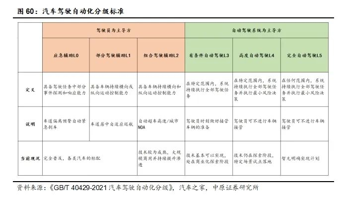 高阶智能辅助驾驶技术沿应用场景和技术迭代持续发展,正加速向L3/L4级迈进。依据2021年颁布的《汽车驾驶自动化分级》国家标准,智能驾驶技术按自动化程度的高低,被分为 L0 到 L5 六个级别。其中,L0-L2属于驾驶辅助阶段,能够减轻驾驶员的负担,但要求驾驶员能随时接管,L3-L5属于高阶自动驾驶阶段,智能驾驶系统承担主要的车辆驾驶职责和相应的责任,只有在特定的情况下才会要求驾驶员作为后援接管车辆,或无需驾驶员接管,目前高阶智能辅助驾驶技术正加速向L3/L4级迈进,核心围绕智能辅助驾驶算力、数据与算法三大要素演进。