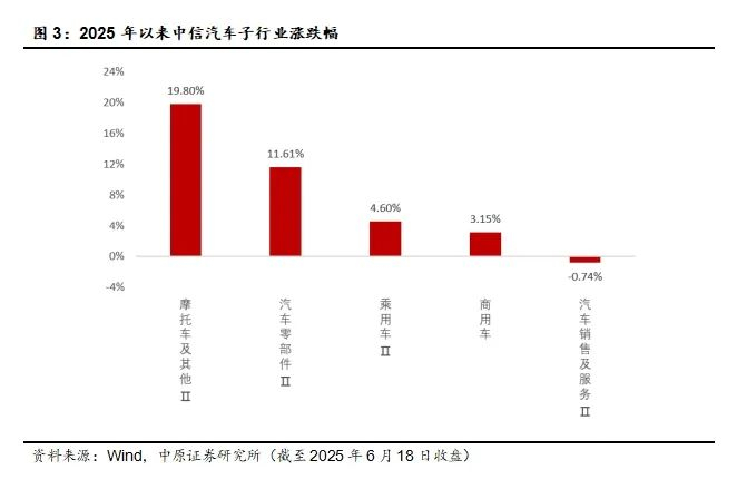 子板块涨势分化,截至2025年6月18日收盘,2025年汽车行业子板块涨跌幅从高到低排序如下:摩托车及其他(+19.80%)、汽车零部件(+11.61%)、乘用车(+4.60%)、商用车(+3.15%)、汽车销售及服务(-0.74%)。