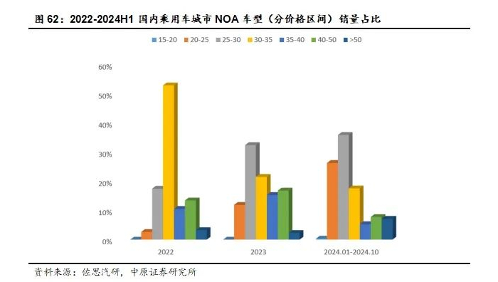 技术发展推动智驾平权,高阶辅助驾驶功能向主流市场加速渗透,进一步推动高阶辅助驾驶规模提升。通过技术降本、供应链发展与市场需求共同作用,智驾平权以 “技术普惠” 打破高端车型的功能垄断,实现智能驾驶的大众化普及。2025年2月比亚迪智能化战略发布会明确宣布,将「天神之眼」智驾系统分为 A/B/C 三个版本,其中天神之眼C覆盖10万元以下车型,实现高速NOA功能,包括自动巡航、智能变道、自动进出匝道等,海鸥成为首款将高速NOA下探至8万元级的车型;小鹏 MONA M03 Max于2025年5月上市,全系标配 XNGP纯视觉系统,支持全国无图城市NOA、高速领航及自动泊车,带动城市NOA下沉至15万元级市场。其他车企纷纷跟进,使搭载高阶辅助驾驶功能的车型价格持续下探。根据佐思汽研,城市NOA功能在20-30万元价格区间的车型中增长最为显著,2024年上半年“20-25万元”这一细分市场城市NOA的装配量增速最快,从2023年的11.88%上升至21.44%,这一趋势表明高阶辅助驾驶覆盖的价格带正往主流市场加速下探,进而带动高阶辅助驾驶规模持续提升。