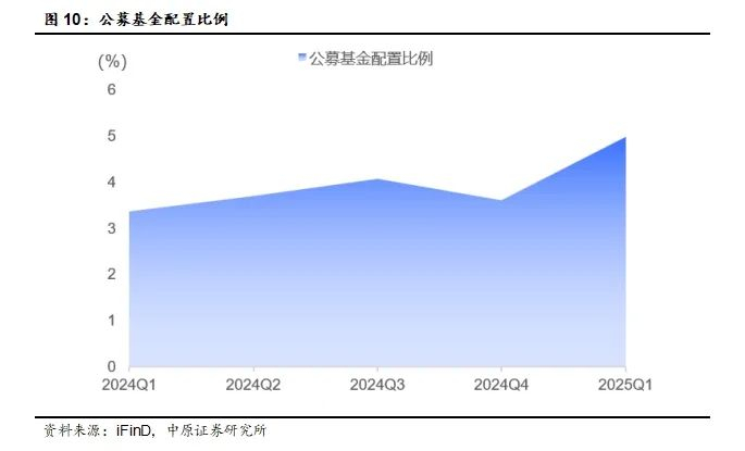 截至2025年Q1,公募基金配置比例(公募基金持有板块成分个股的总市值占公募基金持有所有个股总市值的比例)为5%,较2024年Q4大幅提升了1.39个pct,为自2024年以来的最高水平。