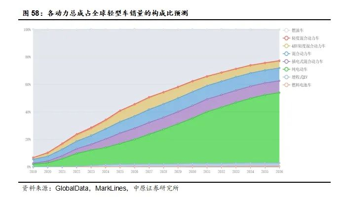 全球电动化长期趋势确定,渗透率提升空间广阔,中国新能源将重塑全球汽车行业格局。根据GlobalData预测,全球轻型车销量中,纯电动车、插电混动、混合动力等动力类型的占比将逐渐提高,而燃油车销量占比随之逐步下降,预测到2036年,燃油车销量占比将降至22.7%,纯电动车销量占比将跃升至动力类型首位,占超过一半的销量达到51.3%,混合动力及插电混动类型占比排在第三、第四位,四种动力类型合计占全球轻型车销量比重达92%。中国新能源车凭借全产业链优势及产品动力类型多元化,将成为全球市场主力并重塑全球汽车行业格局。