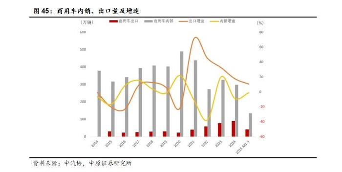 商用车出口表现活跃,占比持续提升。2024年商用车国内销量296.95万辆,同比-9.01%,商用车出口90.43万辆,同比增长+17.5%,与国内市场相比,商用车出口表现活跃,占商用车总销量的比重由个位数已上升至2024年的23%;2025年1-5月,商用车内销、出口分别完成134.18万辆和41.08万辆,同比分别-1.29%、+10.47%,出口增速仍优于内销增速,在国内需求周期性波动背景下,商用车出口凭借产品力优势持续突破,出口增速持续领跑行业,成为商用车产业的有力支撑。