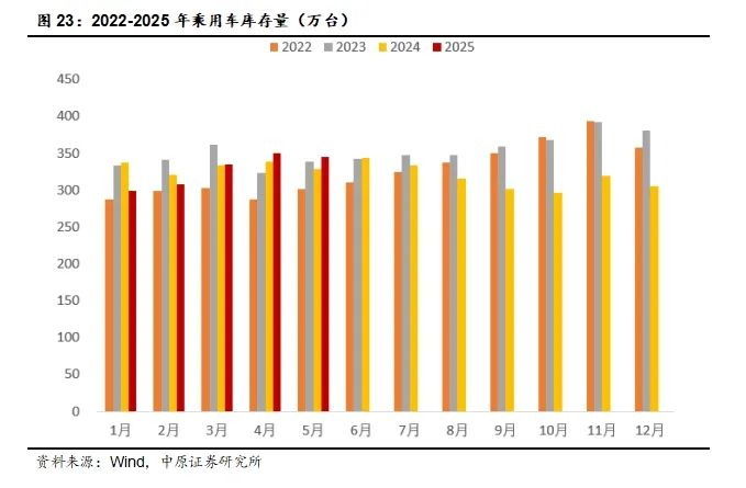 2025年前5个月库存总量持续增长,受政策等因素刺激,车企普遍加大生产备货。2025年5月末全国乘用车库存345万辆,较上月下降5万辆,较2024年同期增加16万辆, 2025年行业库存呈现持续拉升的态势,以旧换新政策将国四车纳入补贴范围,叠加购置税减免,车企总体乐观,普遍加大生产备货,厂家批发相对积极。