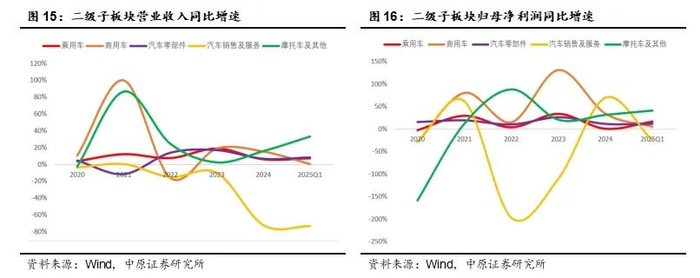 从二级子板块看,除汽车销售及服务子板块以外,其他子板块的收入和利润增速基本维持正增长,其中乘用车和汽车零部件的收入和利润增速较为稳健、波动幅度较小,主要由于技术创新与海外扩张维持增长,商用车由于依赖政策与周期复苏导致波动相对较大,摩托车及其他增速整体向好,而汽车销售及服务的收入呈现下滑走势且利润波动较大;2025Q1除汽车销售及服务以外的其余二级子板块收入端、利润端均有所增长,其中摩托车及其他的增速最高,收入和利润增速分别达到33.16%、40.80%。