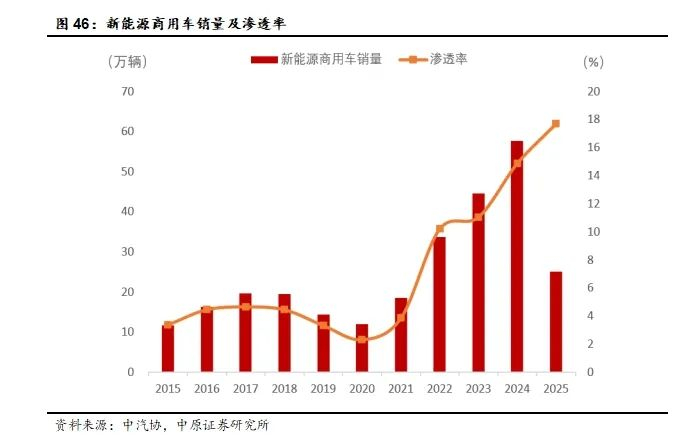 政策与技术驱动新能源商用车销量及渗透率持续提升。国家通过政策补贴、路权优先、充电设施建设等方式,持续推动新能源商用车发展,2022年起新能源乘用车渗透率快速提升,2024年新能源商用车销售57.62万辆,同比+29.27%,其中新能源客车销售14.21万辆,同比+44.45%,新能源货车销售43.41万辆,同比+24.97%;2024年新能源商用车销量在商用车销量占比约15%,2025年1-4月,新能源商用车销量在商用车销量占比已提升至17.69%,快速提升的同时仍有较大的拓展空间。