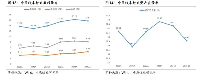 基本面:中信汽车行业近年来收入及利润呈现整体增长态势,2024年及2025Q1收入、利润均实现同比增长;利润率在2024年达到了近5年来的最高点,2025Q1毛利率和净资产收益率略有下降,但净利率水平进一步提升至4.45%;行业资产负债率较稳定,2025Q1降至60%以下。