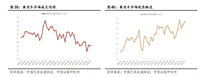 厂家生产热情高,库存占比提升,渠道库存压力降低。2024年整体库存保持相对平稳状态,12月回落在305万辆左右,2025年4月回升到350万辆,厂家和渠道库存均有所上升,且渠道库存占比降低,厂家库存占比提升并接近近几年的高位,4月提升至26%,表明车企基于市场回暖信号,生产热情较高,主动增加生产备货,以应对后续销售旺季的需求增长,并且对渠道库存的占比进行良性调整,适当减少对渠道的压库行为。