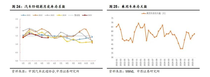 5月乘用车厂商库存、新能源车库存出现下降,库存压力有所缓解。2025年5月汽车经销商库存系数为1.38,环比下降0.03,同比下降0.06,库存水平位于警戒线以下;库存消化周期呈现相近的走势。2025年春季市场回暖,在中央促消费政策持续发力及各地车展等营销活动活跃开展的带动下,生产端保持强势运行,前期去库存特征转向加库存,直至5月末库存出现下降,根据乘联分会数据, 5月总体乘用车厂商总体库存下降11万辆(去年同期下降9万辆),5月新能源车库存也出现下降。