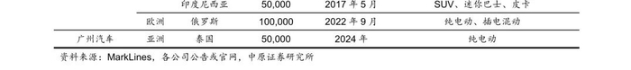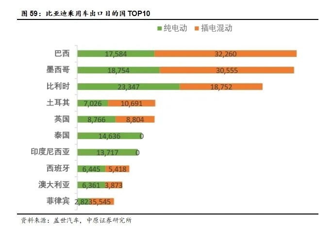 同时布局BEV和PHEV市场的车企具备更高的出口增长动能。在全球动力类型呈现多元化发展的背景下,同时布局多元化动力类型的车企,可实现动力类型互补,出口动能更为强劲。以比亚迪为例,比亚迪是全球新能源车出口量第一的车企,2024年中国新能源汽车出口128.4万辆,比亚迪出口43.3万辆,占中国总出口量的33.7%;2025年1-4月,中国新能源汽车出口64.2万辆,同比增长52.6%,比亚迪出口29.3万辆,同比+110%,远超行业增速,占新能源汽车出口量的45.6%,占到了中国新能源汽车出口量的近一半份额,占比较2024年提升约12个百分点。从比亚迪乘用车的出口目的地和车型可以看出,其BEV和PHEV两种动力类型互补的战略布局,为公司出口注入强劲动能。比亚迪出口市场以PHEV为主导的,包括巴西、墨西哥、土耳其、菲律宾等,以BEV为主导的涵盖比利时、澳大利亚、泰国以及印尼。2025年1-4月,巴西和墨西哥以总计近10万辆的出口量,成为比亚迪出海的核心市场,两大市场的插电混动均远超纯电动销量;比利时作为欧洲重要的物流枢纽,分销到德国、法国、荷兰等西欧核心国家,以超过4.2万辆的数据位居第三,纯电动车型占主流,占比约55.5%。