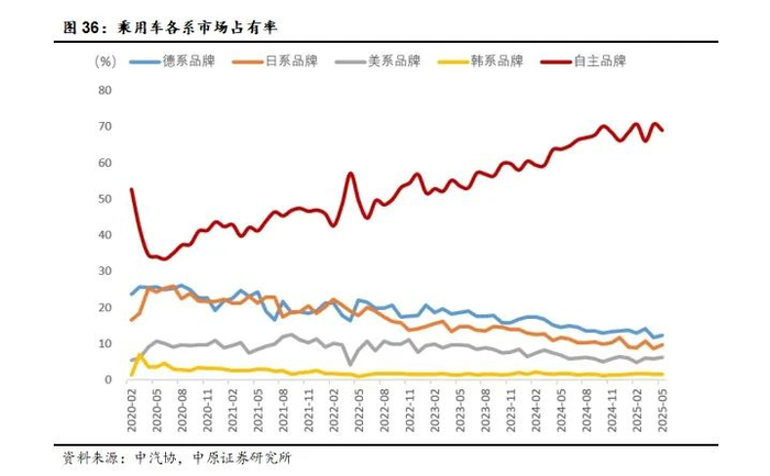 随着自主品牌乘用车市场占有率逐年走高,合资/外资品牌的占有率呈现下滑趋势。2025年5月,德系、日系、美系、韩系品牌乘用车市场占有率分别为12.29%、9.69%、6.16%、1.66%,同比分别-2.31、-2.02、-0.78、-0.12pct,自主品牌在新能源技术、成本、智能化上的全面领先,以及外资品牌战略执行的滞后,导致市占率逐渐拉开差距。未来自主品牌凭借领先优势,市场份额有望进一步提升。