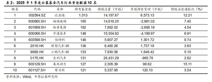 2025Q1公募基金重仓股中汽车行业的前5名分别是比亚迪、福耀玻璃、拓普集团、宇通客车、伯特利,与2024Q4的重仓股前5名比较,伯特利为新进入前5名股票,比亚迪、福耀玻璃、拓普集团、宇通客车稳居前5名,其中比亚迪持仓变化较大,新增6573.13万股。