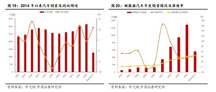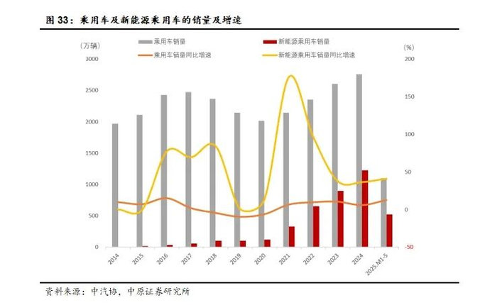新能源乘用车销量保持高增速,渗透率持续提升。中国新能源汽车销量自2015年起首次超越美国,成为全球第一大市场,并连续10年保持领先地位,新能源乘用车的销量增速自2016年起持续高于乘用车销量增速,2024年产销均突破1200万辆,市场占有率超过40%;根据中汽协数据,2025年1-5月,乘用车累计销量1099.56万辆,同比+12.61%;根据乘联会数据,2025年1-5月新能源乘用车合计批发销量523万台,同比+41%,增速显著超越乘用车增速;新能源乘用车在乘用车的市场占有率持续提升,2025年1-5月达到47.59%,同比提升17个百分点,得益于汽车报废更新补贴、厂家降价、新车密集上市等因素,新能源乘用车保持较好增势。
