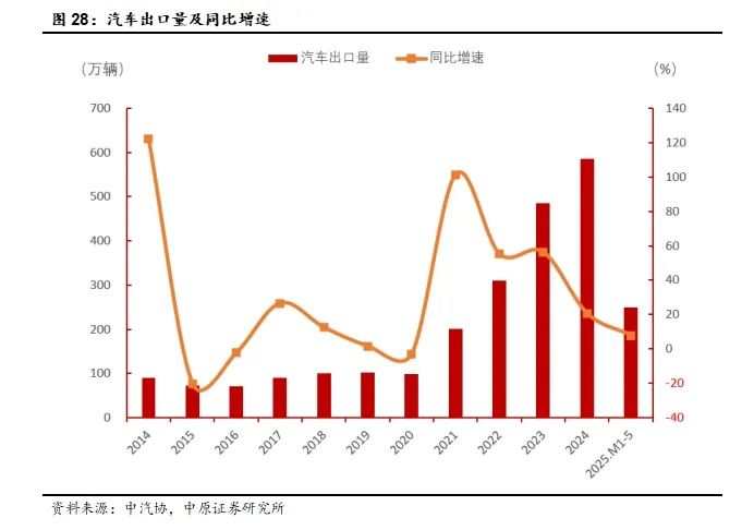 出口持续增长成为行业销量的重要支撑,汽车出口有望持续增长。自2021年起,中国汽车出口量开启迅猛增长态势,突破了前期维持多年的百万量级平台,近年来由于全球疫情影响导致海外供给不足,得益于特斯拉在华本土化生产、中国车企竞争力的持续提升以及俄乌危机等因素,中国汽车出口实现销量的持续突破攀升,2024年以出口586万辆的成绩再创历史新高,增速近20%。2025年5月,汽车出口快速增长,出口量达到55.12万辆,环比+6.65%,同比+14.52%,同环比双增;2025年1-5月,汽车累计出口249.03万辆,同比+7.88%,2025年汽车出口仍延续稳定增长态势,但出口增速较去年同期有所回落,主要由于汽车出口正面临全球范围政治贸易壁垒、出口量基数较高等因素影响;未来随着中国车企加速海外建厂以及KD工厂投产,逐步突破贸易壁垒,实现从 “产品出口” 到 “产业出海” 的升级,海外销售有望持续增长。