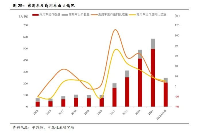 2025年来新能源汽车出口增速亮眼,传统燃油车出口下降。分动力类型来看,以传统燃油车为主的传统能源类汽车的海外市场需求量稳定向好,持续贡献出口增量,2024年出口457.55万辆,占出口比重的78%。新能源汽车自2021年开始出口,出口量持续增长,但近几年增速波动较大,2024年出口128.4万辆,较2023年增速放缓,仅增长6.7%,主要由于海外市场电动化进程不及预期以及关税壁垒政策等影响。2025年前5个月,传统能源车、新能源车分别出口163.5万辆、85.5万辆,分别同比-8.6%、+64.6%,新能源车出口增速显著回升,主要由于插混车型增速迅猛。