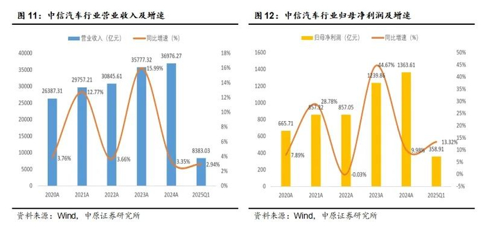 汽车行业近5年的收入及利润呈现整体增长态势,主要受益于新能源汽车的快速增长、政策面的支持、出口量的持续提升,以及电动化、智能化、技术创新等多重因素共振的结果。2024年中信汽车行业实现营业收入36976.27亿元,同比+3.35%,实现归母净利润1363.61亿元,同比+9.98%;2025年1季度中信汽车行业实现营业收入8383.03亿元,同比+2.94%,实现归母净利润358.91亿元,同比+13.32%。