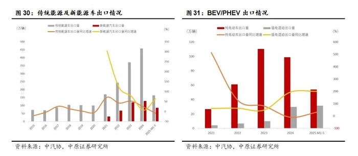 新能源汽车出口细分来看,插混车型是出口重要增长点。出口以纯电动车为主,纯电动车出口从2021年起快速增长,到2023年增速放缓,2024年出口量首次下降,达到98.89万辆,同比-10.44%,而插混车型出口量持续上升,2024年增速迅猛,达到29.69万辆,同比+193.67%,2025年1-5月纯电动车、插电混动汽车累计出口量分别为54万辆和31.5万辆,同比分别+30.3%、+200%,纯电增速回升,插混出口延续高增长趋势,同比增长2倍,增速远超纯电动汽车,主要由于欧盟对中国纯电动车加征关税、海外部分地区充电基础设施不完善等原因所致,而插混车型在欧洲仍适用10%的基础关税,中国车企在欧洲市场调整策略,重点突破插混车型市场。
