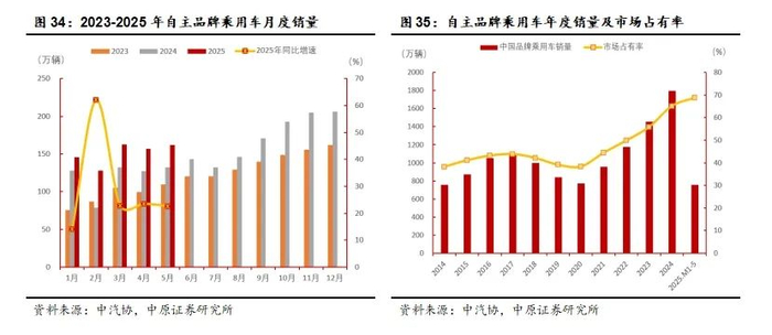 自主品牌乘用车凭借先发优势和技术实力,市场份额持续提升。随着中国汽车厂商在新能源领域的提前布局,自主品牌凭借技术实力在电动化和智能化方面占据优势,带动自主品牌乘用车销量和市场份额不断提升。2025年5月,自主品牌乘用车销量达到162.2万辆,环比+3.3%,同比+22.6%,市场份额达69%,同比提升5.2个百分点。2025年1-5月,自主品牌乘用车累计销量756.3万辆,同比+26.3%,市场份额68.8%,同比提升7.4个百分点。