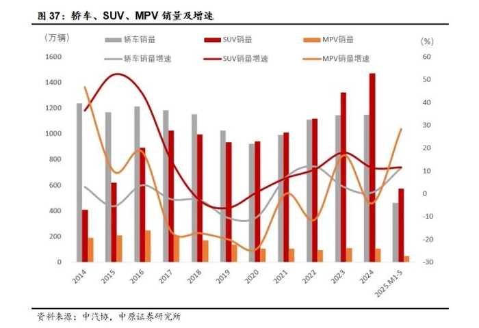 SUV成为销售主力,保持稳定增速。分车型来看,2020年起SUV销量首次超越轿车销量并保持快速增长,已成为乘用车主力销售车型,2024年,SUV、轿车、MPV销量分别达到1472万辆,1151万辆、105万辆,同比分别+11.44%、+0.57%、-4.08%,SUV销量增速显著高于轿车和MPV增速,SUV凭借家庭用户对舒适性和空间的追求,以及新能源时代其车身空间对电池容纳和续航方面的优势,未来一段时间仍将占据乘用车主力位置。