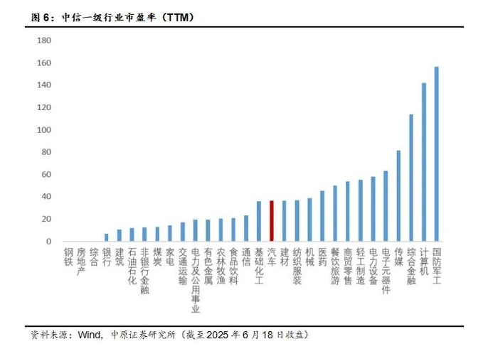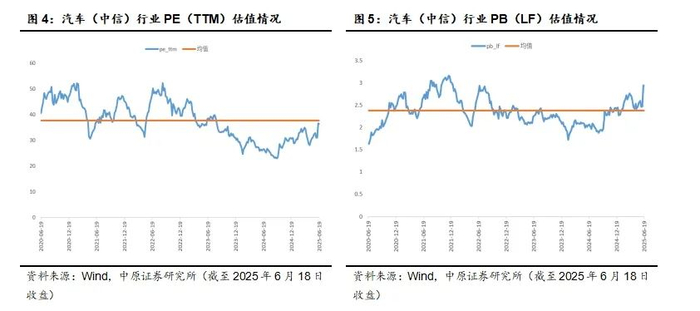 截至2025年6月18日收盘,汽车(中信)板块的PE(TTM)为36.29倍,处于近5年44.46%分位,处于历史中等偏低水平;PB(LF)为2.93倍,处于近5年92.4%分位,估值处于历史较高水平。行业横向对比来看,汽车(中信)行业PE(TTM)在30个中信一级行业中排名第17位。