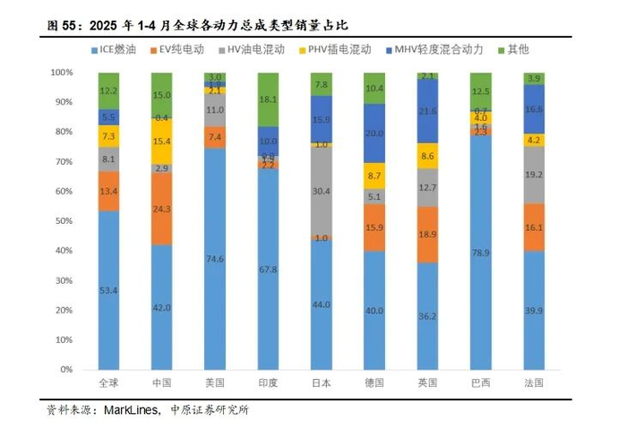 欧洲、北美等发达市场电动化进程遭遇多重现实挑战,动力类型呈多元化发展,混动(HEV/PHEV)占比超纯电动(BEV)。发达市场纯电动相对中国市场偏低,主要受到政策摇摆、补贴退坡、充电基建滞后、油电成本差异、本土车企电动化转型滞后以及关税壁垒等因素影响,进而呈现动力类型多元化发展的特征。2025年1-4月,全球混动(HEV/PHEV)市场渗透率合计达到15.4%,已略高于纯电动(BEV)的13.4%的渗透率,反映出全球动力类型由于国家情况不同而呈现多元化发展趋势。中国纯电动占比最高达到24.3%,超过混动合计占比18.3%,除中国以外,其他主要国家混动占比均超越纯电占比;从混动市场具体动力类型来看,日本、法国、美国以HEV油电混动市场占主流,而英国、德国、印度以MHV轻度混合动力为主要混动类型,巴西的PHEV插电混动在混动中占比更高但比例绝对值较小。
