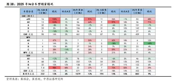 车型两端分化特征明显,微型及小型轿车、中高端 SUV成为增长核心,以传统燃油车主导的紧凑型车型持续萎缩。2025年1-5月,乘用车批发增长12%,零售增长9%,保持稳定的增长,其中SUV仍为销量主力,累计批发571万辆,占总销量的53%,中高端SUV表现较强,中大型及大型SUV累计批发同比增速37%;轿车中微型和小型轿车的销量回升较为明显,累计批发增速分别达91%、64%,主要是A00级轿车销量回升, A0级轿车销量表现也较好;MPV整体表现尚可,当月、累计的批发和零售销量的同比增速均为正增长。