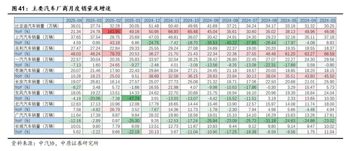 头部品牌加速领跑,厂商表现分化。自2024年5月起,比亚迪汽车月度销量超越上汽集团,跃居行业第一并稳居月度销量首位,销量持续突破 30 万辆级;近一年来增速较高的车企包括:比亚迪、吉利和奇瑞,销量月度增速一直保持正增长,这主要源于三家厂商在新能源汽车领域表现亮眼,处于领先的位置;上汽集团月度销量同比增速从2025年起由负转正,主要由于其新能源车和自主品牌强势增长,4月其新能源汽车销售达12.81万辆,同比增速高达71.74%。