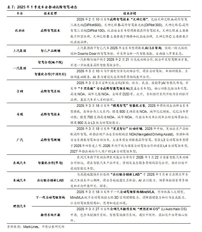 中国车企正加速推动高阶智驾普及,比亚迪、吉利、奇瑞、广汽等多家车企发布高阶智驾技术方案,并推动全系车型搭载高阶智驾,上汽、一汽、东风、长安等多家车企接入DeepSeek大模型。比亚迪发布高阶智驾技术“天神之眼”,全系车型将搭载高阶智驾技术;吉利发布“千里浩瀚”安全高阶智能驾驶系统,覆盖集团全系车型;奇瑞发布“猎鹰智驾”智能化方案,2025年实现全品牌全系车型搭载;广汽集团发布“星灵智行”行动计划,2025年起昊铂全系产品标配高阶智驾,传祺和埃安主流车型搭载高阶智驾。此外,上汽、一汽、东风、长安等多家车企接入DeepSeek大模型。