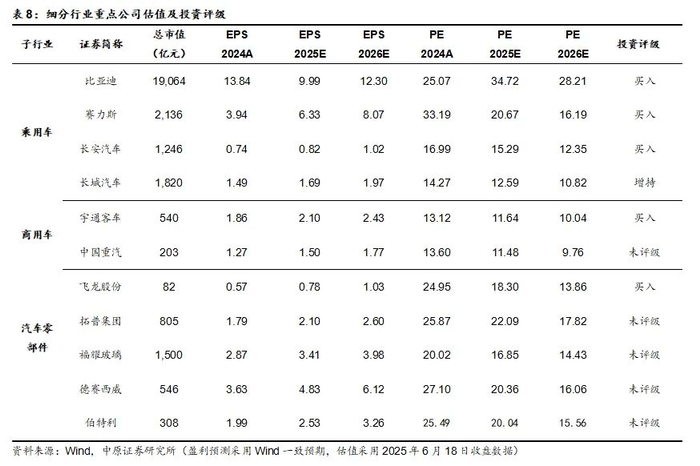 价格战再次开启,行业协会明确表示反对,未来车企或以增配不加价、服务权益加码等隐形方式变相降价。2025年5月,比亚迪率先宣布22款车型降价,随后吉利、零跑、奇瑞、凯迪拉克、智己、长安深蓝、日产等车企一同开启降价,这反映了行业竞争加剧、库存偏高、供需压力较大的情况;之后中汽协发布《关于维护公平竞争秩序,促进行业健康发展的倡议》,反对 “无底线价格战”,指出“无序“价格战”加剧恶性竞争,将进一步挤压企业利润空间,进而影响产品质量和售后服务保障,不仅阻碍行业自身健康发展,也将危害消费者权益,并带来安全隐患”;而后工信部表态支持倡议,强调强化质量与安全,应依靠创新从“价格导向”到“价值导向”跃升。预计短期内价格竞争仍将持续,但在行业监管和政策导向下力度将减弱,未来汽车行业需以智能化迭代与技术突破进行降本并提升产品溢价,从而拓展利润空间,最终摆脱单纯价格博弈的内卷局面,真正重塑以价值为核心的竞争模式。