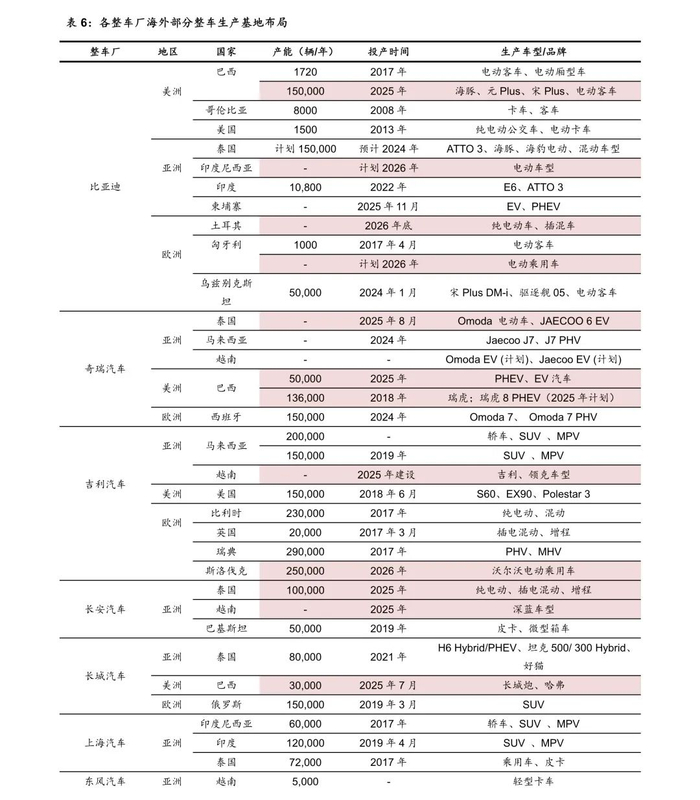 中国汽车产业正加速推进从传统贸易出口模式向全价值链生态化出海的战略转型。中国车企在深耕国内市场的同时,持续推进海外扩张,在东南亚、欧洲、美洲等地区通过全工艺整车制造基地、KD工厂(散件组装)、SKD工厂(半散装组装)等方式,在海外市场构建本地化的研发、生产、供应链及销售服务体系,实现从 "产品输出" 到 "产业生态输出" 的跃迁。从市场层面看,海外市场对汽车尤其是新能源汽车需求持续高涨;贸易环境方面,关税壁垒等贸易保护主义促使车企以本地化生产规避高额关税,维持产品竞争力;成本优化角度看,本地化生产可显著削减运输成本,还能利用当地廉价劳动力与原材料资源,降低整体生产成本;车企在海外本地组装、生产,还有利于将自身先进技术与当地研发力量结合,开发出更贴合当地需求的产品。这一转型包含了技术标准输出、供应链体系重构、品牌生态建设等深层次产业逻辑变革,将使中国车企从 “产品出口” 转向 “规则制定”,在全球汽车产业变革中占据主动地位。