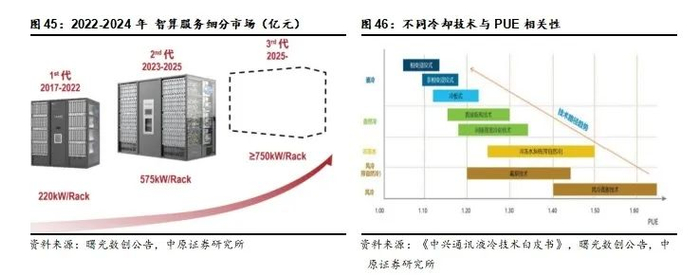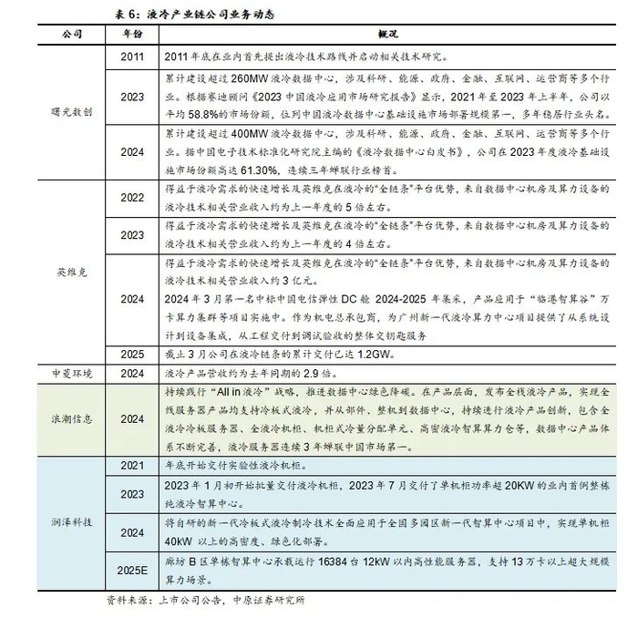在浸没式液冷方面,目前主要用于超算中心,具有高定制化特征。曙光数创作为国内唯一实现浸没相变液冷技术大规模商业化部署的企业,在2024年推出了第三代C8000浸没液冷解决方案,单机柜功率密度突破至750kW以上,为未来算力芯片性能的持续提升和数据中心更高的节能需求提供了技术储备。