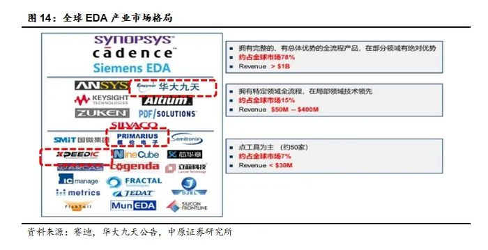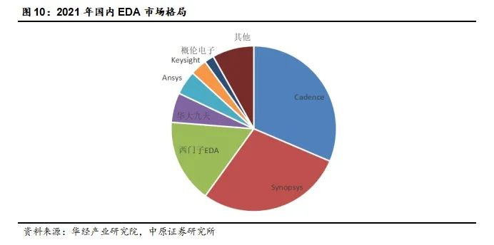 美国三大EDA巨头占据了EDA的绝对垄断地位,也占据了国内EDA市场约8成的市场份额。根据华经产业研究院的数据,2021年,我国EDA市场中,海外一线产商仍然处于绝对的主导地位,其中楷登电子、新思科技、西门子EDA占比分别为32%、29%、17%,国产厂商中华大九天位居第四,占比6%,概伦电子位居第7,占比2%。