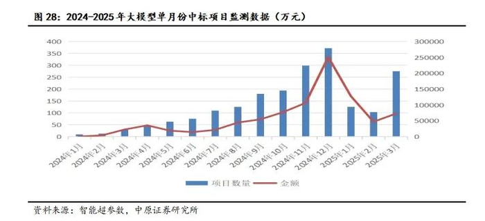 根据智能超参数统计的数据,2025Q1大模型相关中标项目数量为505个,其中121个项目未披露中标金额,其余384个中标项目披露的金额约为24.67亿元,中标项目数量和中标金额同比都有9倍左右的增长。
