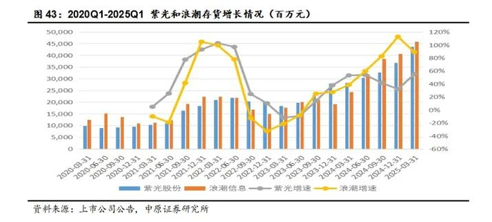 服务器厂商加大芯片备货力度,禁令对短期业务冲击有限,但长期仍有较大不确定性。2023Q3开始,浪潮存货增长速度持续加快,从2023Q3的25%增长到2024Q4的113%,2025Q1又继续增长了89%。与此同时,紫光股份存货也保持了较快增长,2024Q3和2024Q4或受到收购新华三股份带来财务压力,增速放缓,但是2025Q1又快速增长了55%。