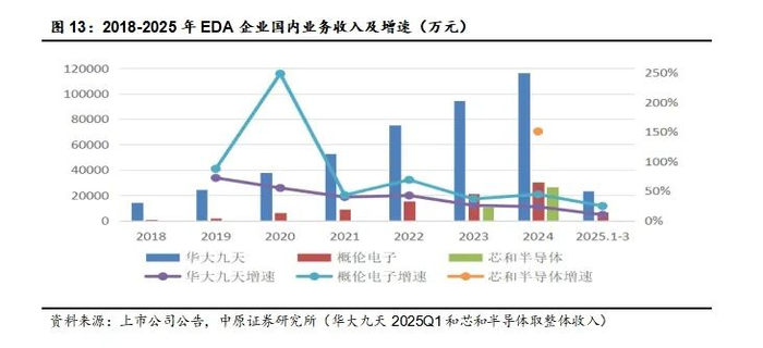 在芯片加快国产化的趋势下,国内EDA企业也受到国产化趋势拉动,维持较高增速。2024年华大九天、概伦电子的国内业务收入分别增长了23.4%和44.27%,芯和半导体也获得了150.38%的收入增长;2025Q1,华大九天收入增长9.77%,概率电子国内业务收入增长24.61%。