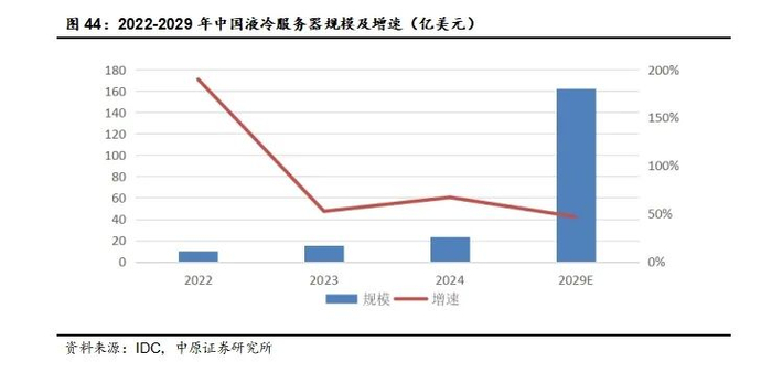 液冷作为数据中心新兴的散热解决方案,虽然在AI带来的高算力需求下蓬勃发展,但是在数据中心渗透率仍不足10%,且以冷板液冷为主。根据IDC数据,2024年中国液冷服务器市场规模达到23.7亿美元,同比增长67.0%,冷板式解决方案市场占有率进一步提高。IDC预计2024-2029年,中国液冷服务器市场年复合增长率将达到46.8%,2029年市场规模将达到162亿美元。相对于浸没式以及喷淋式液冷技术,冷板式液冷对原有风冷机房以及风冷服务器的改动较小,因而成为当前应用最广泛的液冷技术。