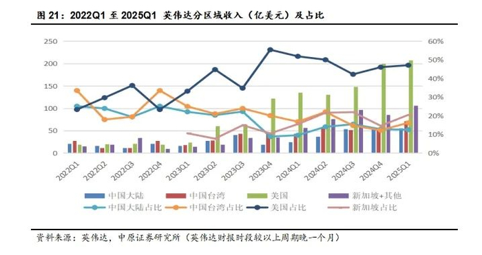 2025Q1中国大陆已经退居英伟达第四大出口区域。其来自美国的收入占比为47%,较前一个季度提升了1 PCT;其第二大收入区域新加坡的收入占比从上个季度的15%回升到20%,需求还在快速释放;而与此同时,中国台湾超过中国大陆,成为了英伟达第三大收入来源区域,占比达到16%;其来自中国大陆的收入已经连续3个季度保持了55亿美元左右的规模水平,没有看到因为AI需求较为明显的释放效应,我们认为这其中仍有较大的需求受到了压制。