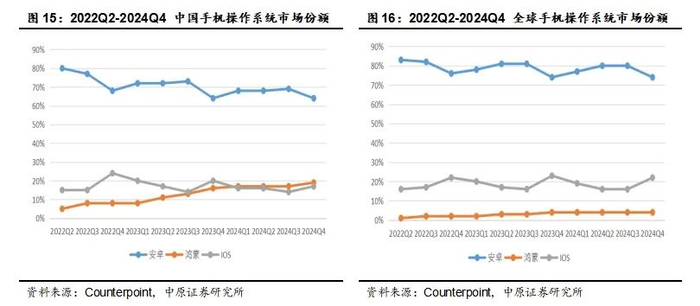继2024年10月纯血鸿蒙HarmonyOS NEXT发布以后,鸿蒙在2024年Q4的份额有明显提升趋势。根据Counterpoint的数据,2024Q4鸿蒙以19%的份额继续位居国内手机操作系统第二名,较Q3提升了2 PCT,同时鸿蒙在全球继续占据4%的市场份额。根据新浪财经4月15日报道,华为HarmonyOS NEXT已经取消了版本回退功能,这预示着手机系统的成熟度已经达到了大规模的商用标准,为整体鸿蒙生态建设做出了重要的突破。