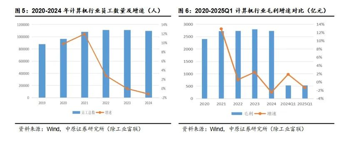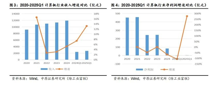 2024年,中信计算机行业总计收入1.80万亿元。考虑到工业富联占比过高(分别占比2024年行业总收入和净利润的34%和73%,以下行业财报数据中均做剔除处理),将其剔除后行业总计收入1.19万亿元,同比增长5.21%,较上年提升了2.10 PCT。2025Q1行业收入2707亿元,同比增长13.20%,较上年提升了5.80 PCT,继续呈现改善趋势。