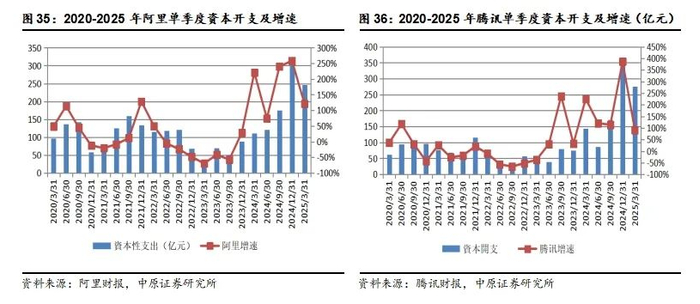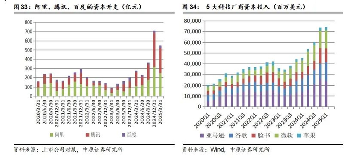 从国内市场来看,Q1阿里、腾讯的资本开支均呈现环比明显下滑,但是对比2024Q3仍有明显增长。腾讯Q1资本开支274.76亿元,同比增长91.4%,环比下滑24.9%,整体位于较高水平。阿里Q1资本开支246.12亿元,同比增长120.7%,环比下滑22.5%。百度Q1资本开支28.69亿元(不含爱奇艺),同比增长42.3%,环比增长24.09%,还没有超过2023Q4 36.41亿元的峰值水平,投入相对保守。
