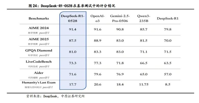 5月DeepSeek并没有如期发布R2,而是进行了R1的小版本升级,并实现了较为明显的性能提升。R1-0528仍然是基于2024年12月的DeepSeek V3 Base模型作为基座,并在后训练中投入了更多算力来提升模型的推理和思维能力。DeepSeek利用这样的更新方式,既实现了与第一梯队模型的性能对标,同时又可以保持模型生态的兼容性和稳定性。而从模型发展范式来看,R1-0528也印证了后训练Scaling在模型能力提升方面的发展潜力。