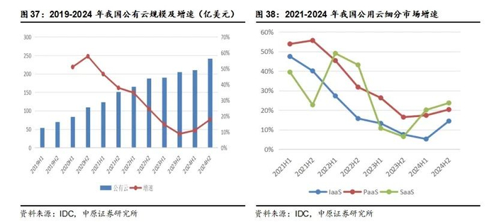 2024年下半年,我国云计算业务见底回升。根据IDC数据,2024H2我国公有云业务收入241.1亿美元,同比增长17.72%。继PaaS、SaaS的增速在2023H2见最低点以后,IaaS增速也在2024H1出现阶段性低点5.2%,2024H2重回两位数增速至14.4%。
