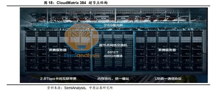 (4)创新性:应用了对等计算架构,而非传统以CPU为中心的冯诺依曼架构。超节点内用高速总线互联替代传统以太,通信带宽提升了15倍,单跳通信时延也从2微秒做到200纳秒,使得集群如同一台计算机般协同工作。