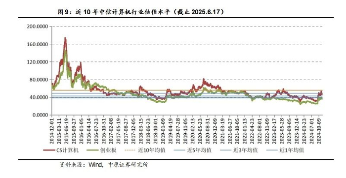 行业的估值位于历史均值之间。根据Wind数据,2025年6月17日中信计算机行业TTM整体法(剔除负值)估值为46.22倍,同期A股估值15.27倍,创业板估值35.01倍。行业近1年、3年、5年、10年的平均估值分别为44.17倍、43.34倍、47.91倍、52.61倍,当前估值仍然位于历史均值水平之间,近3年最高点58.79倍和最低点29.69倍。