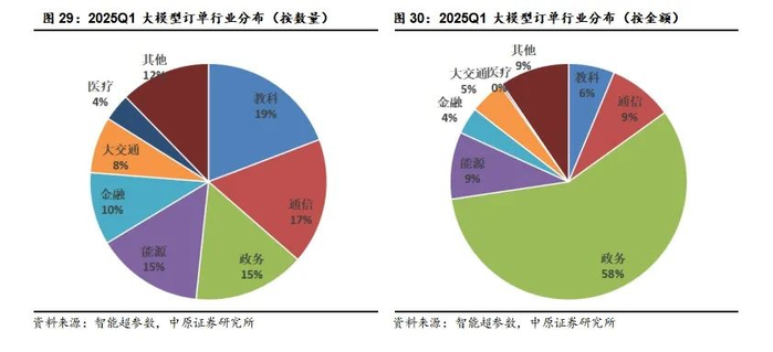 2025Q1大模型在教科、通信、政务、能源领域都有较多的订单,但是相对而言政务行业订单金额却明显领先于其他行业。