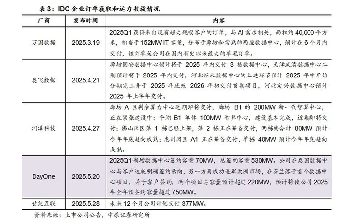 2025年随着AI应用的普及和大规模智算中心的交付,AIDC有望迎来业绩加速期,加速数据中心行业的分化。在新一代智算建设和需求方面,2025年润泽科技和奥飞数据都有相对于自身较大的算力投放计划,万国数据也在2025Q1获得了单笔高达152MW的大规模订单。由于超大规模客户通常需要在短时间内交付至少50MW的IT容量,预计2025年将有较为明显的大规模智算中心集中交付趋势。