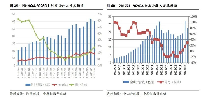从厂商业绩来看,阿里云和金山云收入增速都从2024Q1开始有了明显的改善趋势。其中2025Q1阿里云收入增速达到了18%,较上个季度提升了5PCT,继续呈现明显加快趋势。