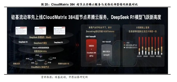 硅基流动联合华为云推出基于CloudMatrix 384超节点昇腾云服务和高性能推理框架SiliconLLM,并基于此上线DeepSeek-R1昇腾云服务,在保证单用户20 TPS水平前提下,单卡Decode吞吐突破1920 tokens/秒(TPS),部署性能比肩H100。
